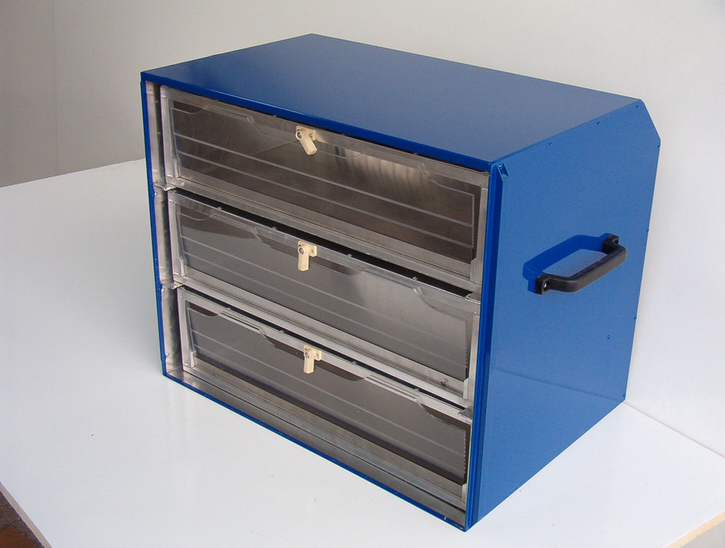 Die Geraldy-Zuchtbox besteht aus Aluminium. Stabile Kunststoffroste bilden den Boden der Box. Eine herausnehmbare Schublade erleichtert die Reinigung. Nistschalen können auf zwei Etagen verteilt werden, was das Risiko zerbrochener Eier stark reduziert. Darüber hinaus können auch Brutschüsseleinsätze eingelegt werden.